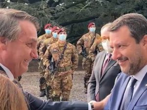 "Voglio scusarmi con il popolo brasiliano per le polemiche nei confronti del presidente Bolsonaro venuto qui oggi": lo ha detto Matteo Salvini, accogliendo il presidente del Brasile arrivato oggi a Pistoia per partecipare alla cerimonia in onore dei caduti brasiliani durante la guerra mondiale. "Bolsonaro è il presidente eletto di una Repubblica amica, venuto qui oggi a ricordare migliaia di soldati che hanno combattuto per liberare l'Italia. È surreale che venga contestato", ha aggiunto.