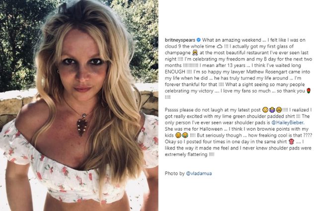 Britney Spears ha vissuto il suo primo weekend senza conservatorship dopo quasi 14 anni, festeggiandolo con un post su Instagram, in attesa del 2 dicembre.
