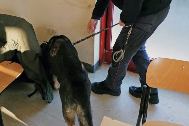 Dopo aver controllato inizialmente i corridoi e le aule, il cane Ron ha portato gli addestratori del nucleo cinofili di Roma fino alla porta di un bagno chiuso da diversi mesi a causa di un guasto.