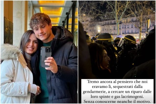 È Andrea Nicole a documentare su Instagram il momento in cui restano coinvolti nella manifestazione Convoglio per la libertà: "Sequestrati dalla gendarmeria, a cercare un riparo dalle loro spinte e gas lacrimogeni".