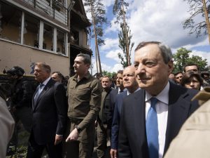 Il presidente del Consiglio, in visita in Ucraina insieme a Scholz e Macron, spiega in conferenza stampa: "Vogliamo la pace, ma Kiev deve difendersi e decidere che pace vuole".