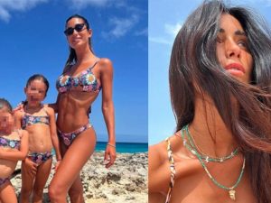 Federica Nargi a Formentera ha sfoggiato un look balneare mini-me con le figlie Sofia e Beatrice: "Solo il costume, per tutto il resto uguali al papà".