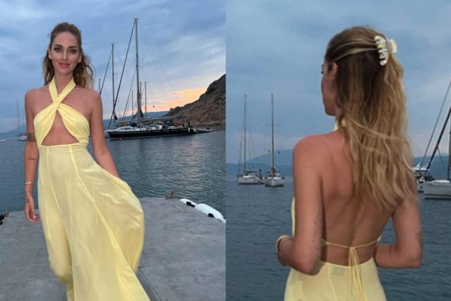 Per l'ultima notte a Idra Chiara Ferragni ha scelto un look poetico ed elegante, ma con un accessorio "pop": indossereste mai l'abito da sera con un mollettone tra i capelli?