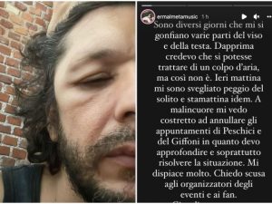 Il cantautore ha spiegato di dover dare forfait a due eventi, tra i quali il Giffoni Film Festival, per via di un problema di salute per il quale dovrà svolgere accertamenti. “Da diversi giorni mi si gonfiano parti del viso e della testa, credevo fosse un colpo d’aria, ma non è così”.