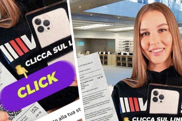 "Congratulazioni! Hai vinto un iPhone 13", recita il messaggio posto sopra l'immagine di una ragazza che tiene in mano uno scontrino e la confezione di un'iPhone 13.