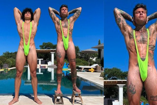 Un po' bikini, un po' costume intero: è il mankini che lascia poco spazio all'immaginazione, portato alla ribalta nel 2006 dal film Borat. Fedez lo ha indossato per rispettare una tradizione con l'amico Luis Sal.