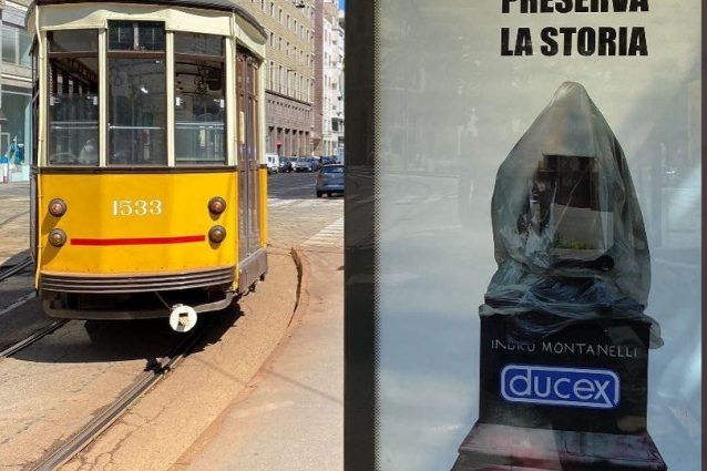 Dopo le polemiche, la richiesta di rimozione e l'attacco vandalico contro la statua di Indro Montanelli nei giardini milanesi dedicati al giornalista, una nuova opera di protesta è comparsa in città. Si tratta di un poster affisso alla ferma del tram di piazza Cavour, in cui è rappresentata la statua avvolta in un profilattico con la parola "ducex" sul basamento e la scritta "Preserva la storia".