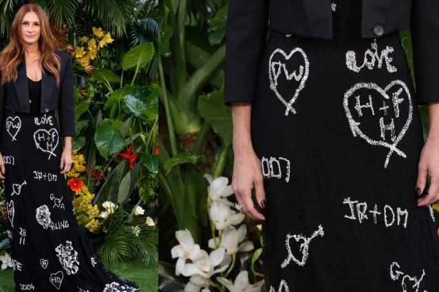 Julia Roberts ha partecipato alla prima mondiale di Ticket to Paradise, il nuovo film in cui recita con George Clooney. Sul red carpet ha sfilato con un abito sofisticato e personalizzato, decorato all-over con delle scritte ricamate che nascondo un dolcissimo messaggio romantico.