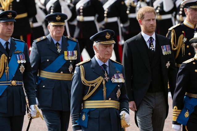 Nonostante dieci anni di servizio militare in Afghanistan, il principe Harry ha seguito la bara della regina Elisabetta in abiti civili durante il corteo verso Westminster.