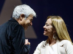 Con una citazione de Il Signore degli Anelli e toni trionfalistici Pino Insegno presenta Giorgia Meloni sul palco di piazza del Popolo per la chiusura della campagna elettorale di Fratelli d'Italia.