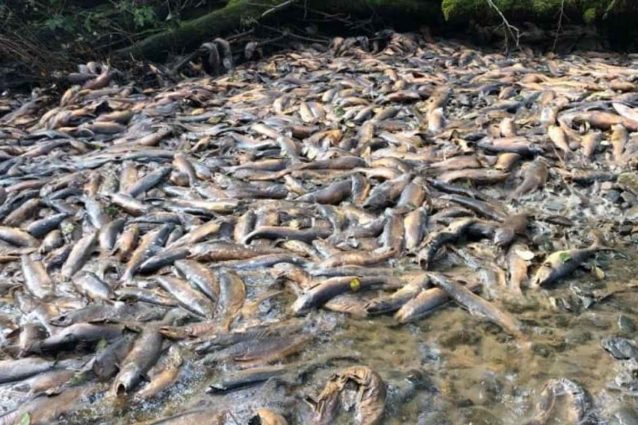Sono almeno 65.000 i salmoni trovati morti in un torrente in secca del Canada. Dopo una lunga siccità, i pesci sono stati convinti a risalire il torrente in seguito a un solo pomeriggio di pioggia che ha provocato l'alta marea.