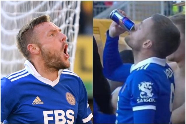 Jamie Vardy si beve una lattina di Red Bull prima di fare il suo ingresso in campo e poi si scatena. Segna il gol dello 0-4 a favore del Leicester e provoca i tifosi del Wolverhampton.