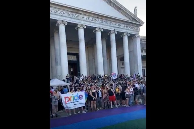 In migliaia in piazza del Plebiscito per festeggiare il Napoli Pride, oggi. Il flash mob è partito alle 18,30, ma sono già tantissime le persone che affollano la grande piazza, che si sono radunate sotto la Basilica di San Francesco di Paola, già da ieri è stata illuminata in Rainbow con un gioco di luci arcobaleno per l'occasione. Lo spettacolo si tiene proprio nell'area dell'emiciclo di piazza Plebiscito.