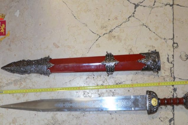 Una donna di 39 anni arrestata a Pompei: prima ha lanciato acqua bollente dalla finestra, poi ha aggredito i poliziotti con una daga romana da 55 centimetri.