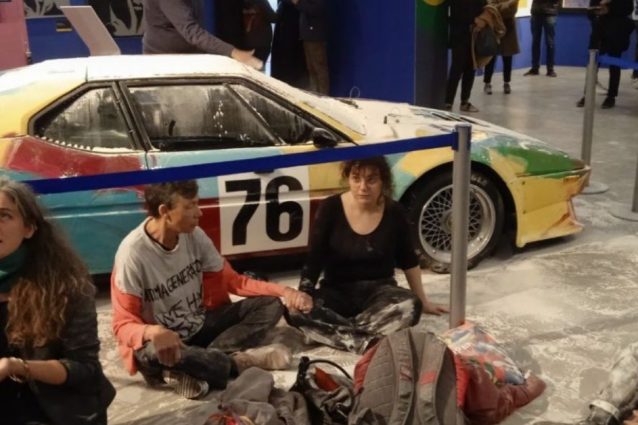 Alcuni attivisti di Ultima Generazione hanno lanciato otto chili di farina su un'opera di Andy Warhol esposta a Milano. Altri hanno fatto esplodere palloncini di vernice e si sono incollati a terra.