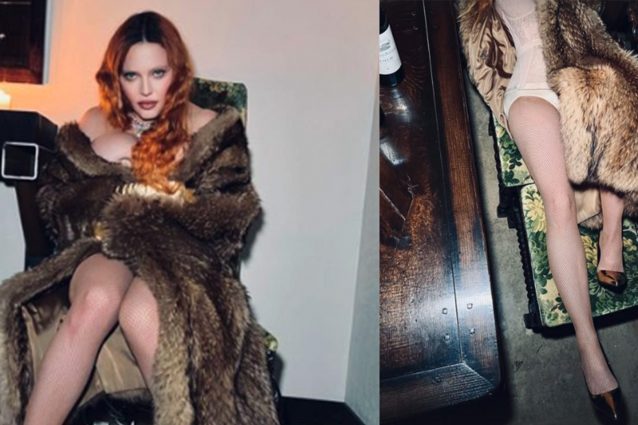 Madonna in tacchi a spillo e calze a rete: sotto alla pelliccia indossa solo la lingerie