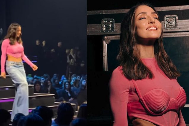 Per la quinta puntata dei Live di X-Factor Ambra Angiolini ha "ripescato" i jeans a palazzo a vita bassissima degli anni Novanta, abbinandoli però al corsetto, il must have del momento.