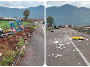Sul posto carabinieri, vigili del fuoco e operatori del 118, che non hanno potuto fare nulla per i due uomini alla guida degli autoarticolati. La strada è stata chiusa.
