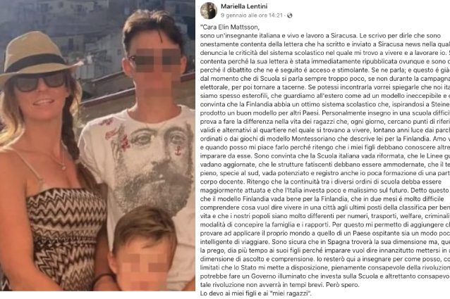 La risposta social di Mariella, docente di Siracusa, alla lettera della pittrice finlandese Elin Mattsson che ha lasciato la Sicilia insieme alla sua famiglia definendo la scuola "un disastro": "Necessaria una riforma ma provare ad applicare il proprio mondo a quello di un Paese ospitante è un modo poco intelligente di viaggiare".