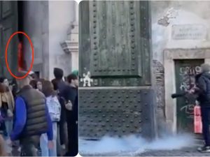Armato di estintore ha spento le fiamme: questa la reazione di un passante quando si è accorto che la porta fra piazzale Flaminio e piazza del Popolo stava andando a fuoco.