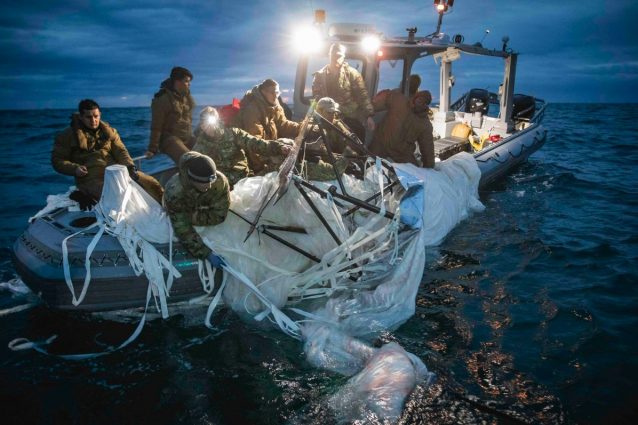 Il pallone aerostatico partito dalla Cina è stato abbattuto il 5 febbraio con un missile aria-aria sparato da un caccia F-22. La US Fleet Forces ha pubblicato una serie di scatti che ritraggono il recupero dei resti di questo dispositivo.