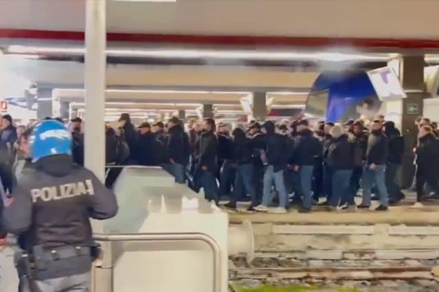 I tifosi dell’Eintracht arrivati a Napoli scortati dalla Polizia urlano cori per la squadra tedesca