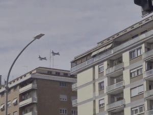 Questa mattina a Roma sono stati avvistati dei caccia militari, alcuni dei quali hanno sorvolato la capitale a bassa quota. Si tratta molto probabilmente delle esercitazioni per la Maratona di domani al Foro Italico.