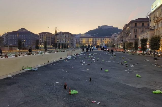 Nonostante l'ordinanza del sindaco Manfredi sul divieto di vendita di alcol in bottiglie di vetro e in lattine, piazza Municipio piena di bottiglie di birra.