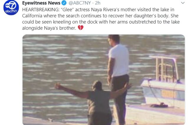 La madre di Naya Rivera in ginocchio e con le braccia spalancate di fronte al lago Piru in cui si ritiene sia annegata la figlia: è un’istantanea che restituisce l’immagine di un dolore impossibile da sopportare. La donna, accompagnata da un altro figlio, fratello dell’attrice, ha raggiunto il luogo dove si sta cercando il corpo della giovane attrice della serie tv Glee.