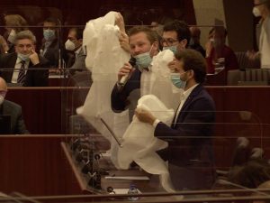 Camici bianchi per chiedere al presidente della Lombardia, Attilio Fontana, di riferire sul "caso camici", la fornitura di dispositivi di protezione per oltre mezzo milione di euro da parte di Dama Spa, l'azienda di cui è titolare Andrea Dini, il cognato del governatore. È la provocazione dei consiglieri del M5S Lombardia in Consiglio regionale che ha portato alla sospensione della seduta da parte del presidente Alessandro Fermi.
