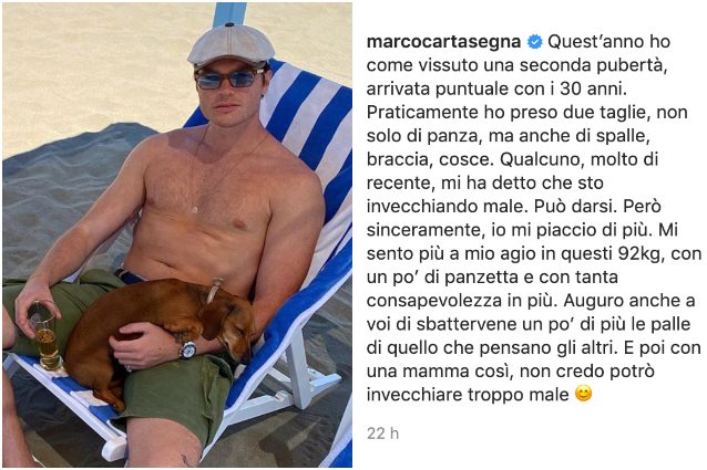 L'ex tronista di Uomini e Donne, Marco Cartasegna, ha pubblicato una riflessione sul suo profilo Instagram. Ha fatto sapere di aver preso due taglie. C'è chi gli ha detto che sta invecchiando male, ma lui si piace di più con i suoi 92 kg: "Mi sento più a mio agio con un po' di panzetta e tanta consapevolezza in più".