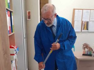 Il preside della scuola per adulti si è fatto fotografare mentre pulisce la scuola per denunciare la carenza di collaboratori scolastici: "Una provocazione bonaria".