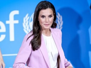 Letizia Ortiz cede al trend dell'autunno e sfoggia un completo giacca e pantaloni. A completare il look anche un paio di orecchini di un noto brand spagnolo.