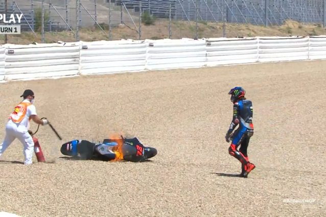 Durante la seconda sessione di prove libere del GP d'Andalusia della Moto2, il pilota del team di Valentino Rossi, Marco Bezzecchi, ha visto la sua moto andare in fiamme dopo essere uscito nella ghiaia sul tracciato di Jerez. Nessuna conseguenza per il riminese che ha chiuso la sessione con il secondo miglior tempo alle spalle del compagno Luca Marini.