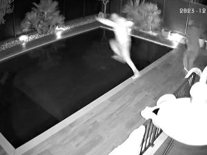 Un ladro che insieme a un complice ha provato a entrare in una casa di Ghedi (Brescia) si è tuffato in piscina pur di sfuggire ai cani. Il video è stato pubblicato dal padrone di casa.