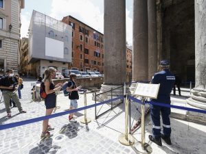 In fila per entrare al Pantheon: si rivedono i turisti nel centro di Roma, sono soprattutto italiani, ma la crisi è ben lontana dalla fine con il blocco dei flussi internazionali. Molti di loro sono proprio attratti dal visitare la Città Eterna senza fare lo slalom tra i torpedoni e senza il consueto caos.