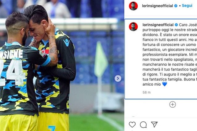 Il capitano azzurro ha postato sul profilo Instagram una foto che lo ritrae insieme a Callejon. "Mi mancherà non trovarti nello spogliatoio, mi mancheranno le nostre risate e si mi mancherà il tuo fantastico taglio in area di rigore. Ti auguro il meglio a te e alla tua fantastica famiglia. Buona fortuna amico mio".