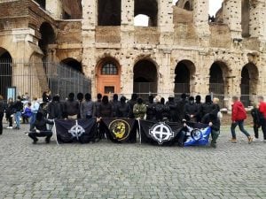 Alcuni estremisti greci hanno esposto bandiere con croci celtiche davanti al Colosseo. Sono in Italia per il ricordo di Mikis Mantakas, l'attivista della Lega nazionale degli studenti greci in Italia e militante del Fronte universitario d'azione nazionale (Fuan) ucciso a Roma il 28 febbraio del 1975.