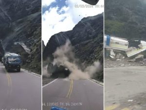 Il terrificante incidente è avvenuto lo scorso 2 marzo a Huarochirí, in Perù. Le incredibili immagini (riprese da una dash cam di un veicolo) hanno fatto il giro del mondo. Fortunatamente nessuno è rimasto ferito gravemente.