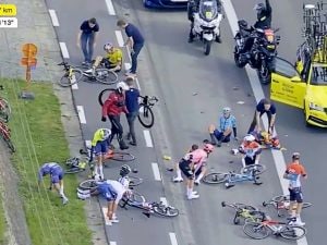 Terribile schianto sull'asfalto nel corso della Attraverso le Fiandre, quando a 64km dall'arrivo in piena discesa e a tutta velocità nel gruppo dei migliori si è perso il controllo. A terra quasi tutti i favoriti, tra cui Wout van Aert che è scoppiato a piangere per il dolore. Trasportato via in ambulanza, per lui niente Fiandre né Roubaix.