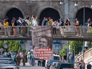 Uno striscione per invitare i cittadini a votare al referendum dell'8 e 9 giugno è stato calato dalla Cgil durante la tradizionale parata per la Festa della Repubblica: "Scriviamo ancora una volta la storia".