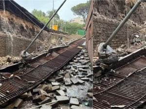 A causa del maltempo sono crollati una ringhiera e un muro di contenimento del supermercato Pim a Monte Mario, tra via Trionfale e via Cortina d'Ampezzo a Roma.