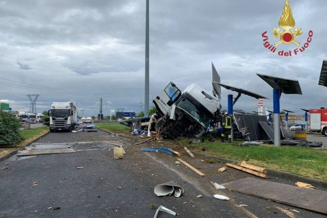 Paura questa mattina lungo l'autostrada A4 dove un camionista ha perso il controllo del tir che si è schiantato contro i pannelli solari dell'autogrill di Dalmine in provincia di Bergamo: il mezzo pesante ha perso il proprio carico composto da tre balle d'acciaio, una delle quali è rotolata verso un distributore di benzina che ha praticamente distrutto.