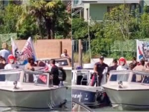Anna Foglietta e Laika sono state fermate dai carabinieri al Lido di Venezia. Erano a bordo di una barca e stavano presentando l'ultima opera dell'artista (We are coming) a sostegno della Global Sumud Flotilla. Sequestrata la bandiera della Palestina che stavano sventolando.