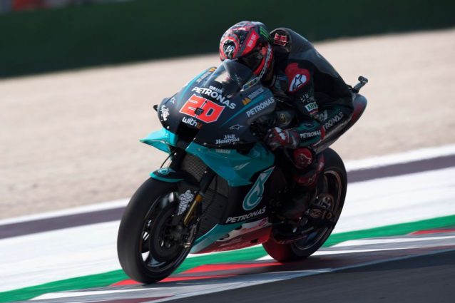 Sul circuito di Misano Adriatico la prima sessione di prove libere del GP dell'Emilia Romagna e della Riviera di Rimini, settima prova del Mondiale 2020 della MotoGP. Risultati: a piazzare il miglior tempo è Fabio Quartararo che precede di 90 millesimi il compagno di squadra in Petronas Franco Morbidelli. Terzo tempo per Pol Espargarò con la KTM. In ripresa Andrea Dovizioso (7°). Nei 10 anche Pecco Bagnaia (10°). Sessione senza acuti per le Yamaha ufficiali di Maverick Vinales e Valentino Rossi.