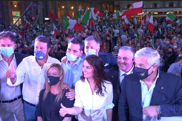 Alla manifestazione della destra che chiude la campagna elettorale per la Toscana, Ceccardi, Salvini e Meloni mettono in scena l'ultimo tentativo di travestirsi da moderati per guadagnare i voti che servono per la vittoria. Poco distante, sul palco del centrosinistra, la preoccupazione per il risultato traspare ormai evidente e i big si tengono alla larga. Storia delle due piazze che lanciano la battaglia cruciale delle regionali di domenica prossima.