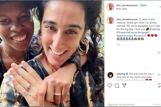 Skin ha annunciato le sue prossime nozze con un post su Instagram. La cantante britannica ha pubblicato delle foto insieme alla sua compagna, la performer canadese Ladyfag, in cui entrambe mettono in bella mostra gli anelli. Ben presto ci saranno le nozze, sebbene il fidanzamento vero e proprio ci sia stato a San Valentino. "Non vedo l'ora" dice la famosa artista inglese, mostrandosi felice ai suoi fan.