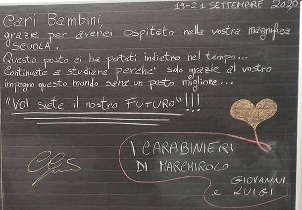 Un messaggio di speranza quello lasciato da due carabinieri di Marchirolo in provincia di Varese sulla lavagna di una scuola elementare nel piccolo comune di Grantola. Dopo aver prestato servizio per le elezioni i militari hanno deciso di esortare i piccoli alunni a studiare perché "sono il nostro futuro".
