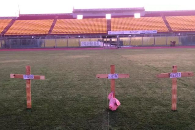 Per protestare contro la grave situazione economica della società amaranto, che rischia addirittura il fallimento, alcuni ignoti sono entrati di notte nell'impianto livornese e hanno piazzato le tre croci e la testa di maiale in mezzo al campo. Il tutto davanti ad uno striscione minaccioso: "Pagherete caro, pagherete tutto".
