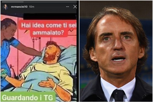 Scivolone di Roberto Mancini, commissario tecnico della Nazionale Italiana di calcio, attraverso il suo profilo di Instagram in merito alla situazione di emergenza sanitaria ed econimica che sta vivendo il nostro paese a causa della pandemia Covid-19: "Come ci sia ammala da Covid? Guardando i tg".